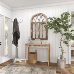 Makes a delightful home accent in entryway, living room, or home office. Bring a finishing touch to your home with an inviting appeal with this console table. A sturdy and long lasting construction that for a years of enjoyment. Designed with protective stoppers at the base that prevent scratching furniture and table tops, as well as sliding around. Suitable for indoor use only. Item has maximum weight limit of 100 lbs. Farmhouse theme.