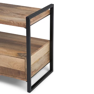 - Features two (2) large drawers, large open shelf, metal frame and drawer pulls in a black finish