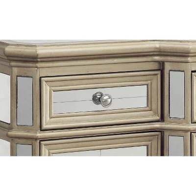 With four drawers and four doors which open to reveal adjustable shelving, you will have ample storage space in this extraordinary credenza. Estaline Champagne and Mirror finish, a multi-dimensional front, turned and tapered feet and polished silver hardware provide style that would add a splash of glamour to any home.