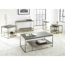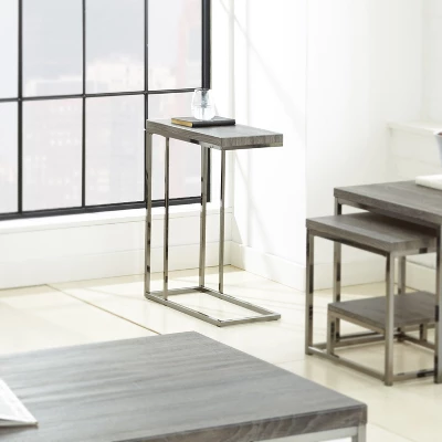 The perfect addition to your living space is the elegant and modern Lucia Chairside End Table with Nickel Gray – Steve Silver. The collection tops and shelves are constructed of a durable laminate that has the look of real wood grain and resists heat, moisture, and scratches. The sturdy chrome frame accents the beautiful dark brown finish.