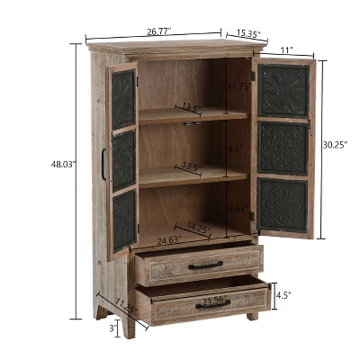 Bring rustic farmhouse style storage to any space in your home with this two-door wardrobe cabinet. Crafted with a antique rustic appearance, this cabinet comes complete with a distressed finish doors made of galvanized metal that open to reveal a spacious interior, perfect for stowing away your clothes, blankets, books, dishes, and other personal items. There are also two drawers that provide additional storage space for your smaller articles, such as, socks, shirts, devices, spare power cords, and remotes. Decorative pull handles accent the fronts of each drawer. A unique addition for your bed room, living room, or dining room.Features: . . . . . 4-Foot-tall rustic cabinet with its multiple storage solutions makes this cabinet versatile and able to complement. most design choices, such as, farmhouse, modern farmhouse, coastal, and traditional. . . Care: Use a microfiber cloth or a disposable electrostatic duster to remove dust. Use a paper towel or soft cloth to blot away liquid spills and condensation from drinks immediately. Wipe away the mess and immediately use a dry microfiber cloth to dry the wood and restore it back to its original finish. Specifications: Product Size: 48.03″ H x 26.77″ W x 15.35″ D Product Weight: 46.2 lbs. Drawer Dimensions: 4.5″ H x 21.56″ W x 11.25″ D Shelf Dimensions: Top: 11.75″ H x 24.63″ W x 13.5″ D; Middle: 9.5″ H x 24.63″ W x 13.5″ D; Bottom: 9.63″ H x 24.63″ W x 14.25″ D Shelf Weight Capacity: 20 lbs. Weight Capacity: 100 lbs. Product Color: Brown, gray