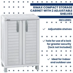 “RIMAX” Medium cabinet with 2 adjustable shelves offers plenty of room for storage and each shelf can hold up to 55lbs. (25 kg) when evenly distributed. It is easy to assemble, move and clean. Made of durable polypropylene that is rust, stain and scratch resistant. The external handles feature a hole for padlock, increasing security of the contents. Its modern design is ideal for indoor or outdoor use. Assembly required.
