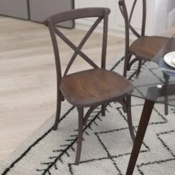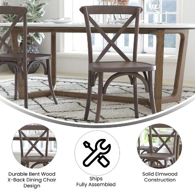 Add the hand scraped look of our stackable X-back bistro style dining chair to your kitchen or dining room for stylish entertaining or everyday family dinners. The timeless design of this high back kitchen chair blends with any décor and never goes out of style. Ash wood construction with downward “U” bracing on all four sides makes for a lightweight, but extremely strong wobble free dining chair. The gray wash dark driftwood finish gives old world charm with a modern twist
