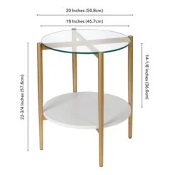 This mid-century inspired side table is the perfect pick for your living room or den ensemble. Its base features four tapered legs connected at the center. The top is a transparent tempered glass which shows off the architectural connection and carries the rectangular design through the frame. The lower shelf is made in a shiny white lacquer, playing off the tempered glass in shape and sheen. It’s finished in gold making it classic and neutral enough to work in any space.Features : Hand crafted gold finish is applied to the steel frame. Tempered glass top and white lacquer shelf.Clean with a soft, dry cloth; no harsh chemicals or abrasive cleaning materials.Features easy assembly.Weight capacity can support up to 40 LBS.Premium materials have been used in the making of this productSpecifications : Product Weight : 16.7 lbsFrame Material : Metal