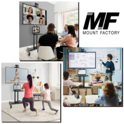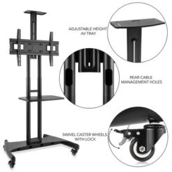 This premium rolling cart has the ability to move your TV or monitor to any room in your home or office. This unit is designed to universally fit most LED, LCD, Plasma TVs and other flat panel displays from 40″ to 65″. This television mount utilizes the standard VESA patterns installed in almost all flat screen TVs with a range of 100mm x 100mm up to 600mm x 400mm. The height of the display (center of the TV) is adjustable from 40″ to 60″ in 2″ increments. Constructed from commercial-grade, heavy-duty steel, this rolling mount is rated with a capacity up to 100 pounds. A convenient, height adjustable component shelf is made to hold a cable box, game console, DVD player, or any other similar device under 10 pounds. This movable cart is loaded with safety features such as an extra wide base measuring 33″ x 29″ for stability and security bolts that lock your TV in place to protect against accidental shifting. The four wheels are heavy-duty casters that roll smoothly and are built with a locking mechanism on each wheel for safety and stability. Convenient openings in the upright poles and back plate provide space to pass cables and wires through for a clean and uncluttered look. Step by step instructions will guide the simple assembly and installation process. Also included is a media top shelf that height adjustable and can support a video camera, game motion sensor, or a similar item. Certifications: RoHS, CE and ISO-9001.
