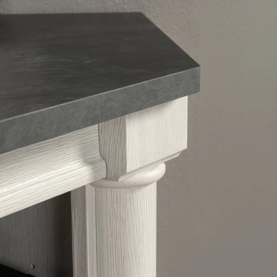 Furnish your home with floor space in mind with this corner credenza from the Palladia® collection. This corner TV stand accommodates up to a 60″ TV weighing 95 lbs. or less, making it the ideal spot to cozy up for a movie marathon with your friends. This entertainment credenza features two large adjustable shelves that have the ability to move to different heights to create flexible storage for items of all shapes and sizes, like your audio/video equipment and gaming console. Two adjustable corner display shelves provide a nook on each side to display home décor and more. This corner entertainment credenza also features two storage drawers that open and close on smooth metal runners for extra unused cables, remotes, controllers, and more. The enclosed back panel has cord access so you can keep wires neat and out of sight. Finished in Glacier Oak™ with Rosso Slate finish accent, this stunning corner media credenza is the small space solution for you!