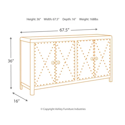 Whether storing plates and linens in the dining room, supplies in the home office or serving as a TV console, this 4-door accent cabinet works a modern industrial look loaded with versatility. Antique gunmetal finish—punctuated with nailhead accents—wows with retro-chic charm. Signature Design by Ashley is a registered trademark of Ashley Furniture Industries, Inc.