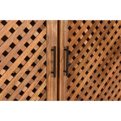 This beautiful three door credenza is finished in our Trellis Black and Burnished Brown. The three doors have an unique open latticework which allows a peak into the roomy shelved interior. Pair with our coordination pieces for a perfect storage option for your kitchen, foyer, or den. **Ships Fully Assembled**