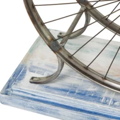 - •Industrial console table features a rectangular top with a two tone color wood design, and supported by duo bicycle wheels structure that are attached to a tiered platform for an elevated display
