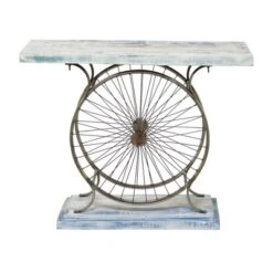 - •This nostalgic rustic console table showcases a rectangular wooden table top, a wheel-sculpted metal body, and rectangle lower base