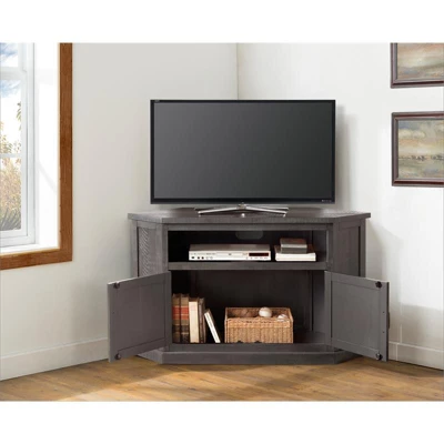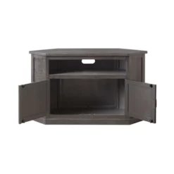 The Rustic Corner TV Stand is designed to maximize space in the living room while not compromising on function and style. Constructed from solid New Zealand Pine with rough sawn details that offers just the right amount of distressing that can blend easily with other rustic, distressed, warehouse, farmhouse or loft looks. An open cubby spans across the TV Stand and offer plenty of room for cable box, gaming systems, or a sound bar. The large cabinet design provides for versatile storage options for additional audio, video, gaming components, or other belongings. Ideal for flat panel TVs up to 55”. Custom finished black hardware. Features the Lightning Fast Assembly System which allows for easy and fast assembly.Features : Finish: GrayConstructed of solid wood – New Zealand PineCorner TV stand design perfectly fits in the corner of the living room for extra space savingOpen cubby offers plenty of room for cable box, gaming systems, or a sound barLarge cabinet design provides for versatile storage options for additional audio, video, gaming components, or other belongingsIdeal for most 55″ flat panel TVsCubby opening dimensions: 31″ W x 6.5″ HSpecifications : Product Dimensions : 50″ W x 30″ H x 19″ DSurface Material : PineAssembly details : Adult Assembly Required, No Tools NeededFurniture Subtype : Corner TV StandsAssembly Required : Yes, Features the Lightning Fast Assembly System