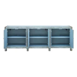 This rectangular credenza adds a mid-century modern feel to your kitchen, dining room, or foyer with its sleek design and metal capped feet. It is crafted with Ash veneer in our Crafter Brown finish, and it features a waffle design inlay on each door for a breezy look. This generously proportioned piece features four cabinets with two shelves for storing dining linen, cookbooks, and more.