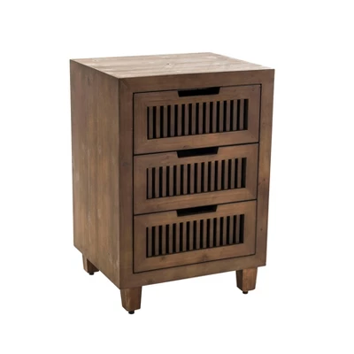 The Sawyer wooden three drawer cabinet imbues your home with strong style that has roots in minimalist furniture philosophies. The clean design does without ornamentation in favor of cool, carved-out drawer pulls, and simple vertical lines create balanced visual interest — the slats on the drawers bring an airy, peek-through touch to the handsome look. A natural charmer, the Sawyer uses quality veneers over the solid ash wood frame, to bring out the rustic appeal of wood knots, graining and figuring. As inviting as its looks is the cabinet’s smart design. The three drawers open on metal glides to reveal generous storage space. Whether it takes root in your living room as an end table, accompanies your bed as a nightstand, or becomes a bathroom storage cabinet…the versatility just adds to the enduring appeal.