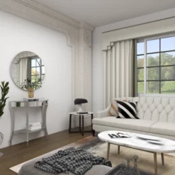 - •Precisely cut glass mirrors outline the top and skirt of this console table that complements its splayed tapered legs