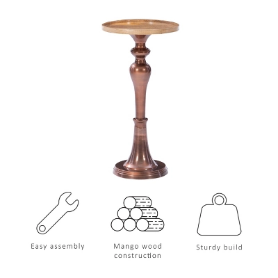 - Mango wood top and copper plated aluminum pedestal complement many decor styles
