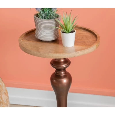 Upgrade your decor with this beautiful end table. The solid mango top and antique copper plated pedestal combine vintage looks with a modern accent. It nestles easily between living room chairs to make the perfect perch for your favorite drink. Set it in a bedroom corner to display a favorite photo or use as an elegant kitchen or bathroom stand. The round wooden tabletop is recessed to securely hold delicate vases or small potted plants. This unique piece is a splendid complement to virtually any furniture ensemble.