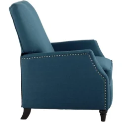 Bold blue linen upholstery accented with nailhead trim adds a fresh twist to the traditional push back recliner chair design. Tapered wood legs complete the look. The chair reclines to two positions.