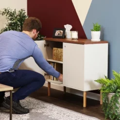 • CONVENIENT INDOOR CABINET: This mid-century modern accent cabinet is designed to be used in indoor spaces only. Add a classic piece with a modern twist to any room in your home for convenient storage anywhere.