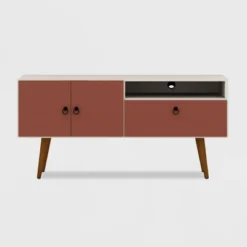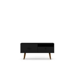Part dresser, part living room entertainment focal point, the Tribeca TV stand is Mid-century modern at its best, and is as versatile as it is functional. This piece couples as a dresser and easily showcases your television, tucking away any media accessories in the concealed shelving space, while an open shelf perfectly fits a DVD player or laptop. In the bedroom or in the living room, stow throw blankets, clothing, or table linens, this piece goes easily from space to space and blends with existing decor to create a statement. Splayed legs and clean lines make for a seamless look.