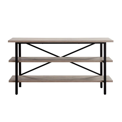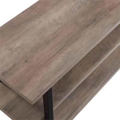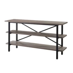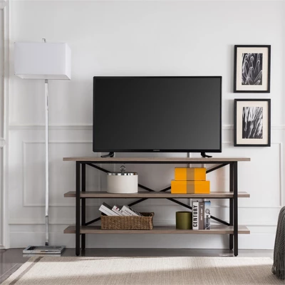 Strong geometric lines set this modern TV stand apart. Its black metal accents offset the rich wood tone, creating a warm neutral color palette that will blend seamlessly into any design scheme. A must-have for living areas and entertainment spaces, this TV stand sets the stage for the big game, a movie marathon, or that season finale everyone’s been talking about.Features : Finished in gray oak with black metal accents.The top has a weight capacity of 75 lbs. Lower shelves can hold 25 lbs. each.Two lower shelves for storage.Accommodates most flat-screen TVs up to 58 inches. Made from premium metal and tempered glass this media console can support up to 75 LBS.Premium materials have been used in the making of this productSpecifications : Product Weight : 68.9 lbsFrame Material : Wood