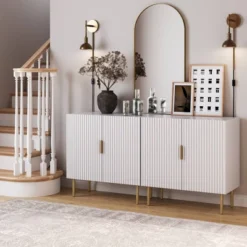 Vera is a white sideboard buffet cabinet with brass gold legs that will complete your mid-century style living space. It highlights a white fluted textured body and brass legs that command attention without being too much to the eye. The brass detailed handles can easily be removed if you want an even more minimalist look.