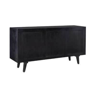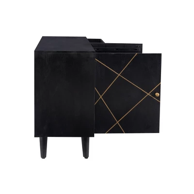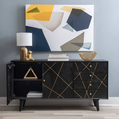 Tidy up your home while introducing a bold sense of style in one fell swoop with this eye-catching console. Constructed of solid mango wood for strength and durability you can count on, this piece boasts 4 drawers that hold up to 35 lbs a piece as well as 2 shelves that each support up to 60 lbs. The black finish with striking gold lines will pop in a variety of decor settings and serves as the perfect tv stand in your entertainment area or as extra storage in your living room, entryway, or bedroom.