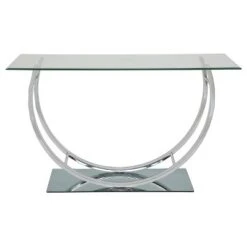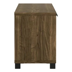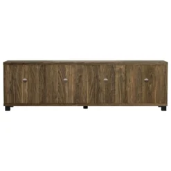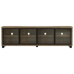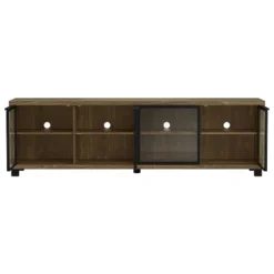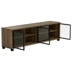 Create a sophisticated space to enjoy your favorite movies and shows. Designed to fit a large TV up to 78 inches, this stylish TV console is perfect for home entertainment. The aged walnut finish showcases wood grain accents for a touch of rustic charm. Black metal accents add depth and dimension to its simple, straight silhouette. With eight roomy storage compartments, this transitional TV console gives you all the space you need for electronics, games, and other essentials.