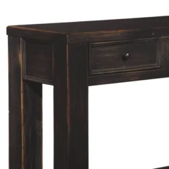 Accent your favorite space with a touch of rustic charm by adding this Sofa Table to your home decor. With Its durable wood construction, this table is sure to stand up to the rigors of heavy daily use. The table is finished in a vintage weathered black tone that has the right amount of distressing to give it a laid back vibe. Just stow your remote controls or gadgets. in the four drawers and show off accent pieces and more on the bottom shelf.