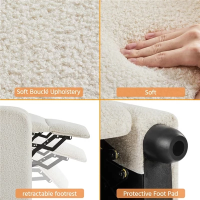 - It has a robust engineered wood frame, multiple padding materials including thick foam, fiberfill, sinuous springs and pocket spring, and soft-to-the-touch polyester boucle upholstery. The solid structure can easily bear up to 120 kg / 265 lb. The super soft seat, armrest, backrest and footrest reduce fatigue after a long day at work, providing you with an amazing seating experience. This recliner is a fantastic addition to your living room, bedroom, home theater, office and more.