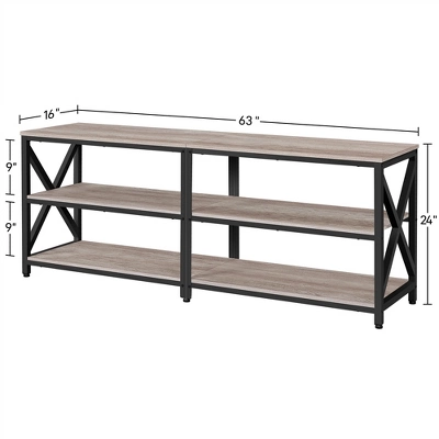 - This storage TV console table, which is crafted out of the high-qualified particleboard and supported by a strong iron frame with two X-shape strengthening structures, is durable and safe for long-time service.Featuring rustic color, simple structure and minimalist lines and edges, our TV stand is designed into a vintage style that can harmoniously integrate into almost any room decors and create a welcoming and soothing vibe to your space. Except for the excellent materials and nice style, we also attach great importance to its practicality. Under the tabletop arranged a 2-layer open shelf divided into 4 independent grids. You can store your CDs, books or anything you want on it.